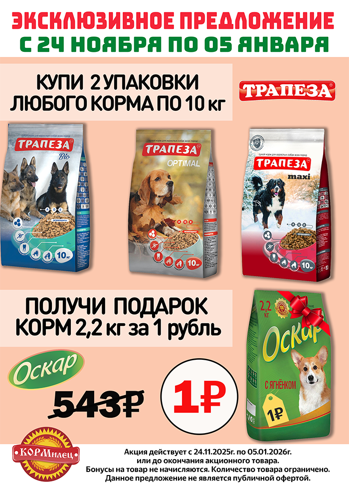 При покупке любых двух мешков: Трапеза Оптималь 10 кг (арт. 10093, 27562), Трапеза Макси 10 кг (арт. 13013, 27563), Трапеза Био 10 кг (арт. 13679, 27564)