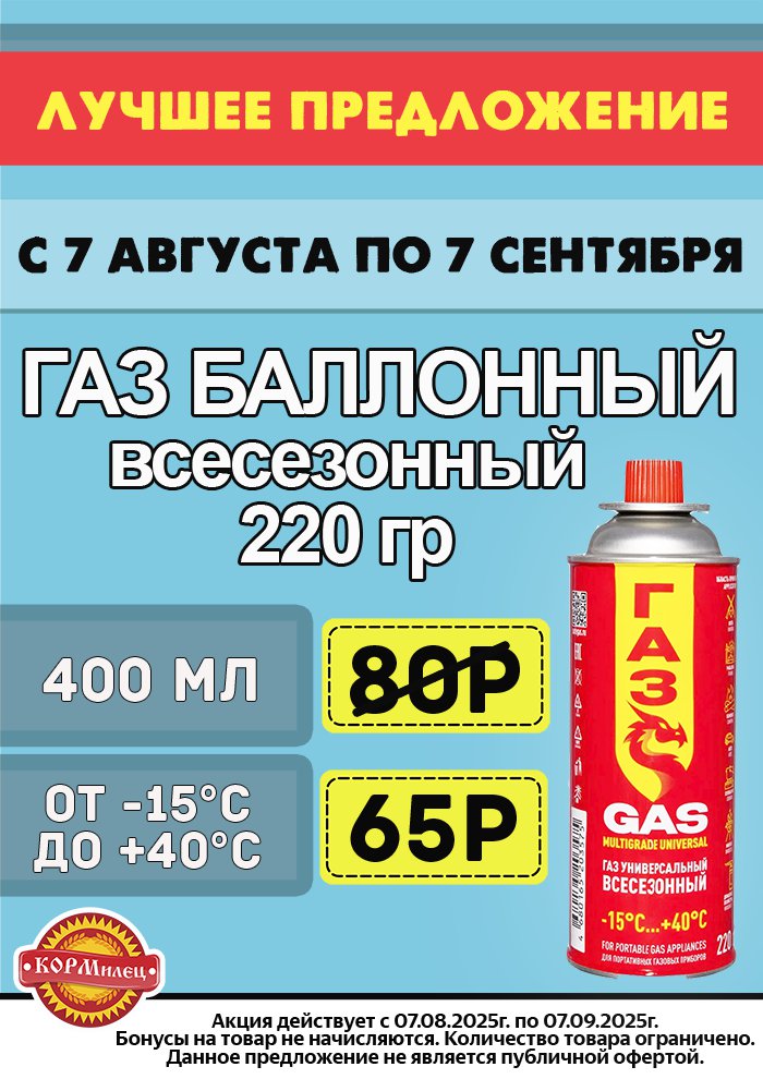 Товар, участвующий в акции: ГАЗ БАЛЛОННЫЙ 220 гр, 400 мл