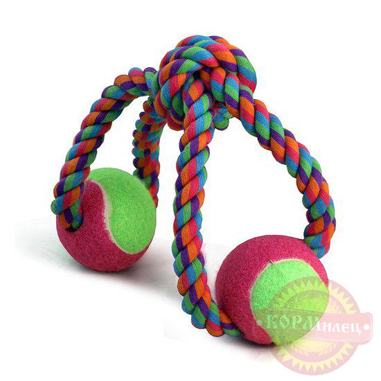 Веревка цветная с двумя узлами и мячом 560г. Предназначена для тяговых игр с собаками крупных пород. Хорошо развивает челюсть собаки. Удобная ручка - противоскользящая. Игры с Вашим питомцем помогают поддерживать его в хорошей форме. Выполнена из 100% натуральных материалов. Цвет: разноцветный. Размер d65*490*160мм.