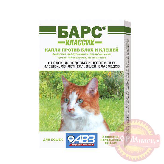 Капли Барс против блох и клещей для кошек классик для лечения и профилактики энтомозов (вши, блохи, власоеды), саркоптоза, нотоэдроза, отодектоза, хейлетиеллеза, поражении иксодовыми клещами. По внешнему виду лекарственный препарат представляет собой прозрачную маслянистую жидкость от желтоватого до желтого цвета.