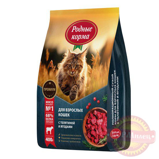 Для здоровой и полноценной жизни кошке требуется сбалансированное питание, которое содержит необходимое количество белков, жиров, углеводов, витаминов и минералов. «Родные корма» для взрослых кошек — один из примеров высококачественных премиальных кормов для домашних питомцев. Ключевые особенности: высокое содержание мяса (№1) в составе; полнорационный состав, обеспечивающий все потребности взрослой кошки; отборное качество натуральных ингредиентов; корм премиального класса. «РОДНЫЕ КОРМА» — это гарантия качества и забота о здоровье Вашего любимца. Высокое содержание мяса (МЯСО №1 в составе) соответствует биологическим потребностям организма, а функциональные добавки улучшают качество жизни питомца. Особенностью корма «Сухой полнорационный корм РОДНЫЕ КОРМА для взрослых кошек с телятиной и ягодами» является наличие в составе ягод, богатых антиоксидантами, которые способствуют укреплению иммунитета и поддержанию здоровья кожи и шерсти кошки. Телятина — источник легкоусвояемого белка, который обеспечивает энергией и способствует правильному развитию мышечной массы. Кроме того, в «Родные корма» входит пробиотический комплекс - это живые клетки Bacillus subtillis, Bacillus licheniformis, которые защищены структурами пектиновых комплексов, они практически не подвержены негативному влиянию кислой среды желудка и высокой температуры при производстве гранул сухого корма.