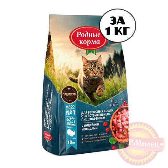 Сухой полнорационный корм РОДНЫЕ КОРМА для взрослых кошек с чувствительным пищеварением.