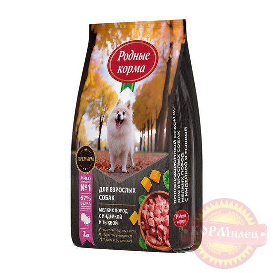 Полнорационный сухой корм РОДНЫЕ КОРМА для взрослых собак мелких пород.