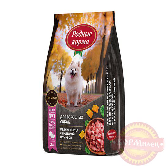 Полнорационный сухой корм РОДНЫЕ КОРМА для взрослых собак мелких пород.