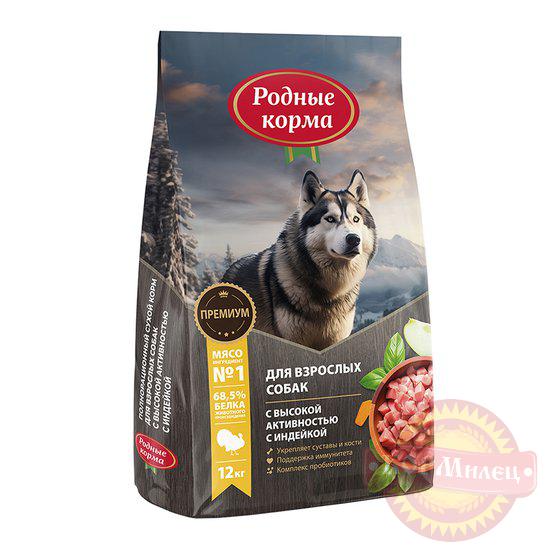 Полнорационный сухой корм РОДНЫЕ КОРМА для взрослых собак с высокой активностью с индейкой.