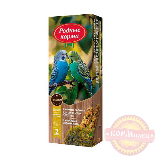 Лакомство РОДНЫЕ КОРМА палочки для волнистых попугаев с морскими водорослями.