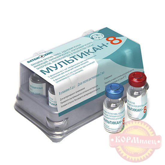Мультикан-8 - вакцина против чумы, аденовирусных инфекций, парвовирусного и коронавирусного энтеритов, лептоспироза и бешенства собак. По внешнему виду лиофилизированный компонент представляет собой сухую однородную мелкопористую массу желто-розового цвета. Жидкий компонент - прозрачную или слегка опалесцирующую жидкость, цвет которой может варьировать от светло желтого до розового с серо-белым осадком на дне флакона разной интенсивности, разбивающимся при взбалтывании в гомогенную взвесь.