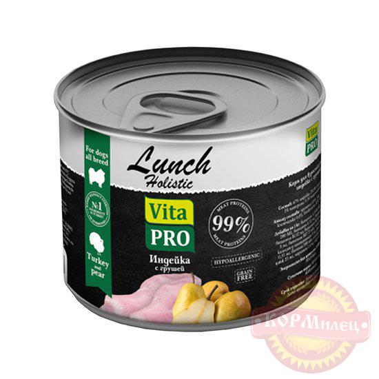 Консервы VITA PRO LUNCH - это полнорационный беззерновой влажный корм на основе мяса говядины с добавлением груши для взрослых собак всех пород.